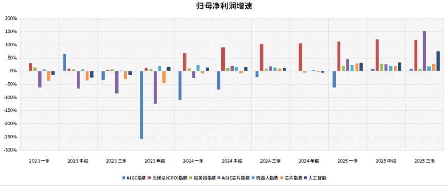 值得注意的是,本季度业绩增长的出现了结构性变化。上半年,市场的焦点集中于算力基础设施,如AI服务器、光模块、PCB等硬件环节的订单和业绩爆发。而三季报显示,增长动能正在扩散和演进。一方面,算力端的景气度从光模块等核心部件,蔓延至ASIC芯片、服务器整机、液冷等更多细分环节。另一方面,更令人欣喜的是,应用端公司的业绩出现显著改善,部分AIGC龙头实现了扭亏为盈或利润大幅增长。这标志着产业发展逻辑发生了重要转变:从前期由算力基础设施建设推动应用发展,转向由应用端商业模式的成熟和爆款产品的出现,反向拉动对算力更持久、更深层次的需求。这种“软硬兼施、应用反哺”的良性循环正在形成,为产业的长期健康发展奠定了坚实基础。